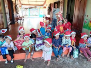 院童們見到來訪, 開心不已. 雖然興奮, 但也遵從照護人員的指示, 先坐定道謝完後, 才各自帶上帽子領取餅乾.  可見院方對院童們除照護外, 也在教育方面付出. 我們深為感動.